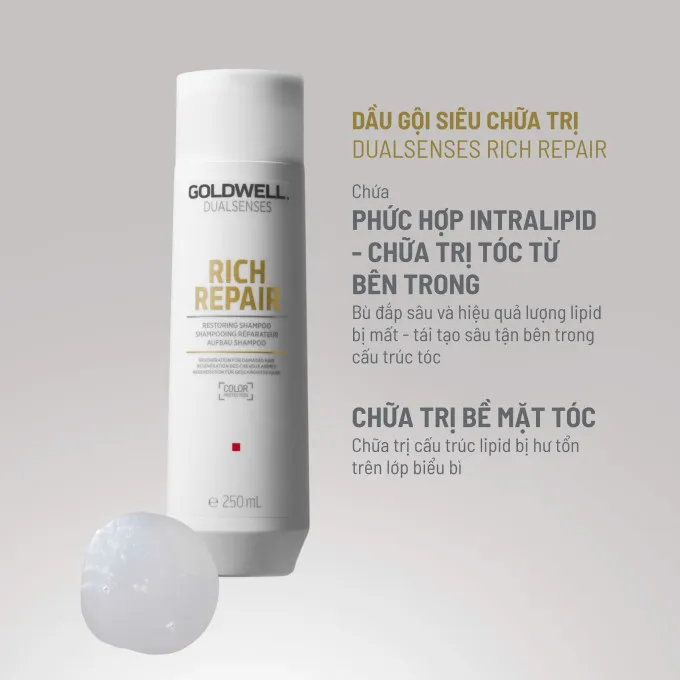 Dầu gội Goldwell Dualsenses Rich Repair phục hồi tóc hư tổn là sản phẩm giúp khôi phục cấu trúc từ sâu bên trong cho ngay cả mái tóc hư tổn nặng và đánh thức độ bóng bẩy tự nhiên của mái tóc.