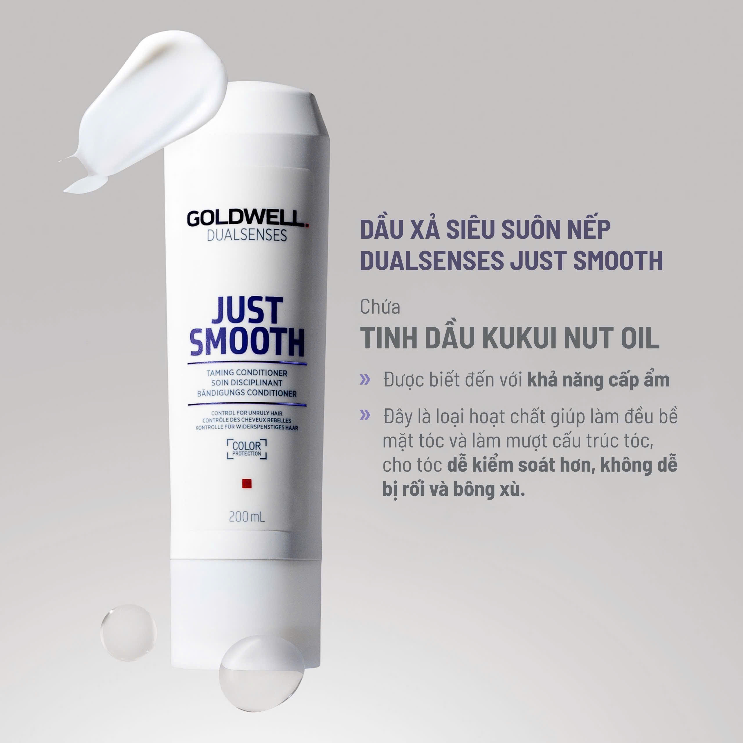 Goldwell Dualsenses Just Smooth Taming cung cấp một hiệu ứng làm mượt và tiếp thêm sinh lực ngay lập tức. Chứa phức hợp microPROtec và Kukui Nut Oil, được biết đến với tính chất giữ ẩm.